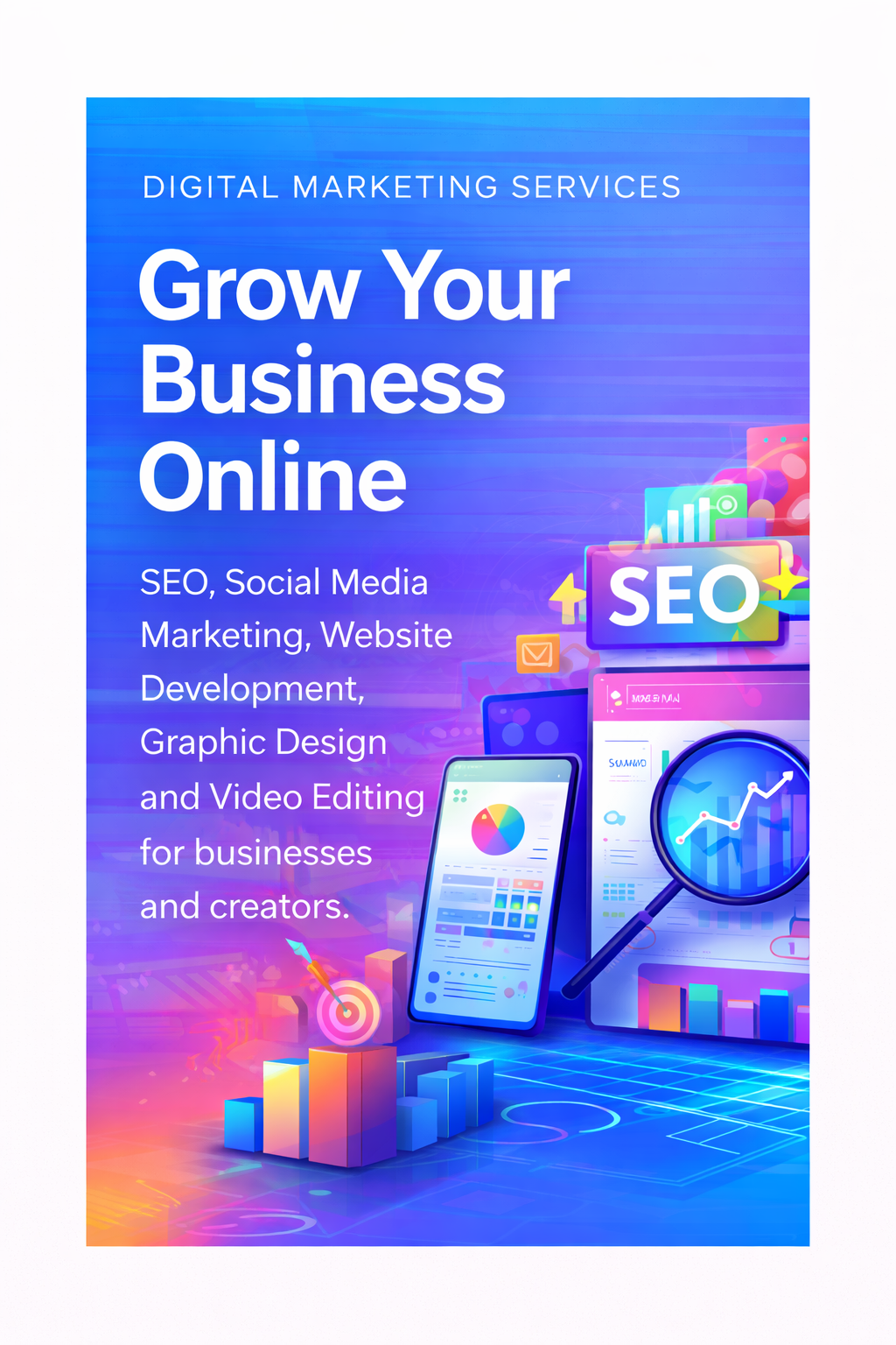 SEO, Social Media Marketing, Website Development, Graphic Design and Video Editing services for businesses and creators.