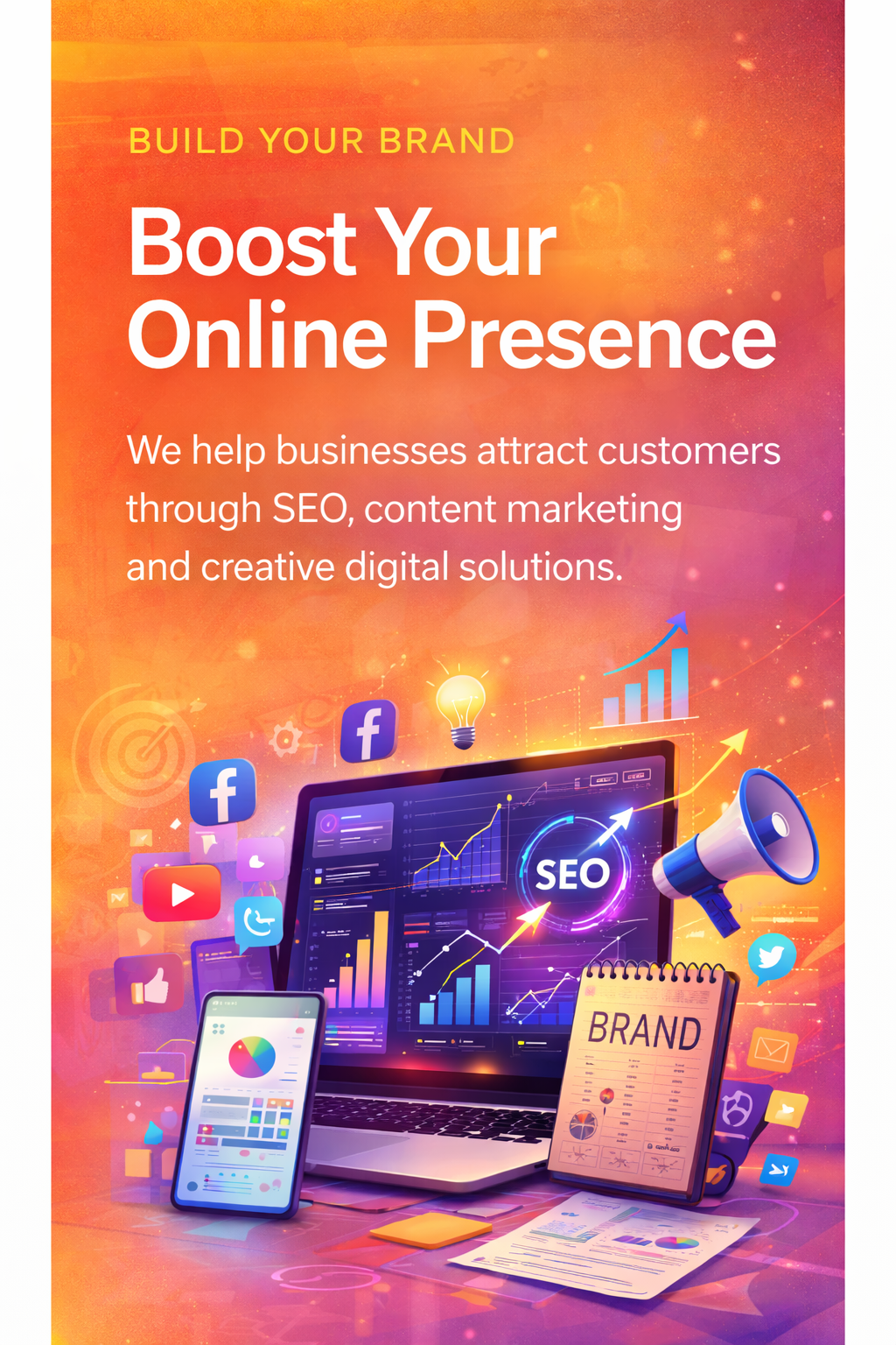 Our digital services empower your business to thrive in the online world. We offer custom website design and development, ensuring a responsive and user-friendly experience across all devices. Our SEO strategies drive organic traffic and improve search engine rankings, while our social media management helps you engage with your audience.